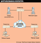 Сравнение централизованной и распределенной архитектуры локальной сети показывает, какие перемены происходят в сети при изменении потребностей в области связи и/или типов трафика. На рисунке слева централизованная структура на базе постоянных виртуальных каналов достаточна для удовлетворения требований объединенной сети. С добавлением новых приложений коммутируемые виртуальные каналы позволяют обеспечить дополнительную гибкость, необходимую для удовлетворения этих требований (см. рисунок справа).