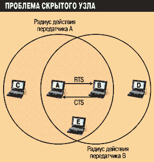При нахождении приемника в радиусе действия двух активных передающих устройств из-за наложения сигнал оказывается испорчен. Кроме того, зачастую станции могут находиться вне пределов зоны действия друг друга, а это ведет к дополнительным сложностям. Первое, что приходит в голову, - попытаться воспользоваться CSMA и передавать сигнал только тогда, когда эфир свободен. Однако не все так просто. Например, если станция A передает сигнал станции B, а станция C находится вне радиуса действия станции A, то C не зафиксирует передачи и ошибочно заключит, что она может передавать данные. В результате передача C вмешается в передачу A, и B не сможет принять кадр от A. Невозможность зафиксировать передачу потенциального конкурента ввиду чрезмерной его удаленности называется проблемой скрытого узла. Мы можем рассмотреть и обратную ситуацию. Пусть B передает A, и C слышит этот сигнал. В результате она может отказаться от передачи вообще, хотя ее передача никак не повлияет на прием станцией A, так как последняя находится за пределами радиуса действия передатчика C. Эта проблема называется "проблема слышащей станции". Иногда в англоязычной литературе она именуется "проблема захвата" (capture problem).