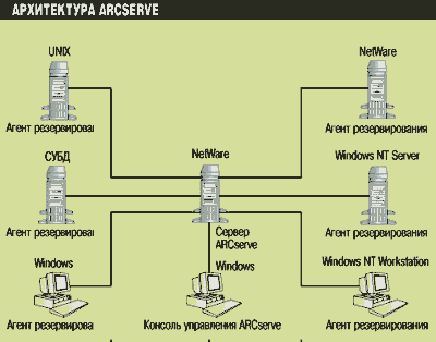 Серверный компонент системы ARCserve устанавливается на один из серверов NetWare с подключенным к нему накопителем на магнитной ленте. Этот компонент отвечает за обработку трафика резервного копирования, ведет журналы операций и отвечает за обращение к накопителю на магнитных лентах. (Кроме ARCserve for NetWare Cheyenne предлагает ARCserve for Windows NT и ARCserve/Open for UNIX, где в качестве серверной платформы выступают Win-