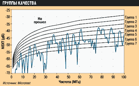 Как показано на рисунке, Microtest разделяет диапазон приемлемых значений NEXT по семи группам качества с шагом в 3 дБ (в конце 100-мегагерцевого спектра). Данный тест предусматривает проверку на соответствие минимальным требованиям и определение принадлежности к той или иной группе качества. Например, кабель с представленными на рисунке характеристиками попадает в группу 3. Если вы хотите модернизировать имеющееся устройство PentaScanner для градации качества кабеля, то компания Microtest предлагает комплект расширения PentaScanner 350.