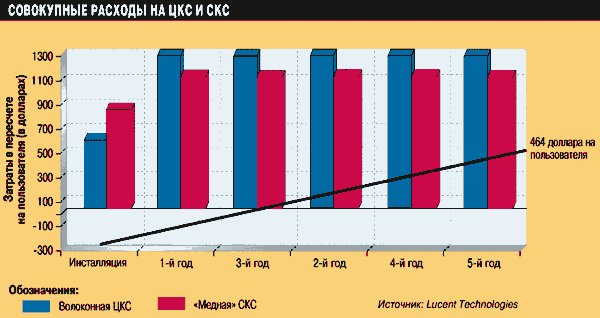 Во-первых, централизация администрирования кабельной системы (по-английски эта концепция называется single administration point) сокращает расходы на персонал. Если все сосредоточено в одном месте, то вне зависимости от размеров здания все работы может осуществлять минимум сотрудников, при этом им не надо бегать по этажам, что экономит их время. Во-вторых, централизация контроля за кабельной системой повышает ее надежность, поскольку вся она всегда находится перед глазами. Администратор сможет быстро локализовать возникшие проблемы, а также своевременно предотвратить их возникновение. Эти два коротких пункта выражаются в серьезной экономии средств (не в последнюю очередь, за счет повышения надежности, о чем у нас часто забывают). На Рисунке 2 приведен типичный график сопоставления совокупных затрат на "медную" СКС и "оптическую" ЦКС, предоставленный Lucent (разумеется, в каждом случае его надо составлять отдельно, исходя из специфики решения). Как видим, за пять лет изначальная разница стоимости порта с избытком компенсируется экономией расходов на эксплуатацию. В нашей стране у информационных систем несколько другая "бухгалтерия", но даже при меньшей отдаче со временем за те же самые деньги у вас окажется лучшее решение. Не будем утверждать, что так будет для всех и везде (хотя бы потому, что кто-то, может быть, не в состоянии сразу заплатить всю необходимую сумму, несмотря на последующие большие накладные расходы). Но поскольку долгосрочное планирование постепенно укореняется и на российской почве, то приведенная диаграмма, несомненно, заслуживает внимания.