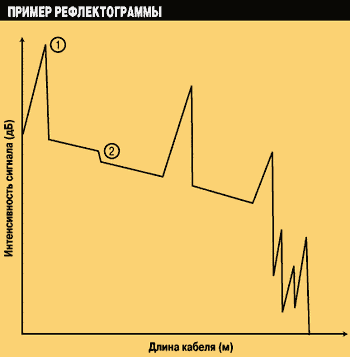 Мультиметр позволяет определить только падение скорости линии (или ее полную неработоспособность), но не причину и местонахождение дефекта. Получить такую информацию в полном объеме можно только при помощи рефлектометра. Прибор определяет все точки, где происходит обратное отражение или резкие изменения сигнала, строя график, подобный изображенному на Рисунке 5. Главные недостатки рефлектометров - цена и точность. Цена рефлектометра может доходить до 15 000 долларов. За счет более простой модели (с монохромным дисплеем, цифровой строкой, рефлектометр - плата для компьютера) затраты можно заметно снизить. Однако в любом случае "мертвая зона" рефлектометра (длина кабеля, на протяжении которой прибор не способен обнаружить дефект) может достигать, в зависимости от типа определяемых аномалий, 10-15 метров, и больше. На телекоммуникационных магистралях это весьма незначительный участок, а в локальной сети в мертвой зоне может оказаться весь горизонтальный отрезок. Поэтому заказчику надо иметь также дополнительный отрезок кабеля (компенсирующая катушка) для выбора мертвой зоны. Заказчику (если, конечно, это не очень крупная корпорация) вряд ли стоит тратиться на такой прибор, поскольку, может статься, экономичнее будет просто заменить все неисправные линии целиком, без локализации аварийных мест, чем покупать рефлектометр, не говоря уже о вызове специалистов от инсталлятора.