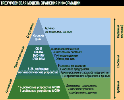 Рисунок 1. Модель хранения данных состоит из трех уровней: оперативных запоминающих устройств для частого и быстрого доступа к данным; почти оперативных устройств для хранения данных, доступ к которым осуществляется время от времени; автономных устройств для создания архивов. Технология оптических устройств хранения данных лучше всего подходит для почти оперативных и автономных устройств.