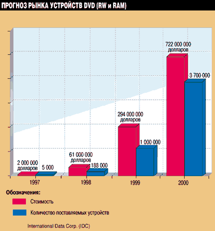 Рисунок 4. Популярность 5,25-дюймовых магнитооптических устройств достигнет своего пика в ближайшие два года. Хотя в 2000 г. объемы поставок увеличатся, в финансовом выражении объем рынка этих устройств останется прежним, поскольку из-за конкуренции производители будут вынуждены снизить цены.