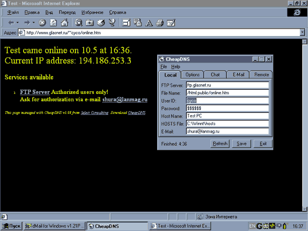 Для решения подобных проблем существует ряд утилит, классифицируемых на серверах условно-бесплатного программного обеспечения как публикация IP-адресов (IP-publishing). Мы нашли около полутора-двух десятков программ этого класса, различной степени сложности. Некоторые из них ориентированы главным образом на работу через PPP, другие слишком просты для того, чтобы посвящать им целую рубрику. После недолгих размышлений я остановился на ПО CheapDNS. Название, на мой взгляд, не совсем удачное, поскольку непосредственно с сервисом DNS эта утилита никак не связана, хотя механизм ее функционирования отдаленно и напоминает работу DNS. Аналогия с DNS заключается в том, что для того, чтобы сделать свой IP-адрес известным всему остальному миру, требуется воспользоваться внешним сервером Web. CheapDNS создает на нем документ на языке HTML, с информацией о текущем IP-адресе машины, обратиться к которому могут все желающие. Разумеется, для этого заинтересованному пользователю нужно иметь к данному серверу доступ по ftp с надлежащими правами. Вид и дизайн этого документа можно варьировать, создавая для CheapDNS соответствующий шаблон. Правила создания шаблона просты — это может быть любой HTML-документ со специально отведенными местами (полями), куда программа помещает текущие значения параметров — имя пользователя, его псевдоним (alias) и реальный адрес, дату и время последнего изменения документа (выхода в эфир, так сказать). Если пользователь хочет сделать адрес недоступным, то ему достаточно выйти из CheapDNS. Перед тем как прекратить работу (в том числе и при выходе из ОС), программа изменяет документ HTML. Вы можете также задать, как часто она должна его обновлять. По умолчанию CheapDNS в начале работы создает документ, где просто указывается IP-адрес и время входа в сеть, а по завершении сеанса документ сообщает, что IP-адрес абонента недоступен. CheapDNS позволяет также установить факт нахождения в Сети других пользователей утилиты (для этого CheapDNS требуется указать соответствующие страницы Web). Для того чтобы обратиться к сервисам, нет необходимости непосредственно читать эти страницы в поисках нужной ссылки или самого IP-адреса. Cheap DNS позволяет автоматически запускать приложения, которым IP-адрес сообщается в качестве параметра по ссылке на имя в окне удаленных пользователей CheapDNS. Утилита может также автоматически уведомлять о выходе в Internet определенного пользователя.