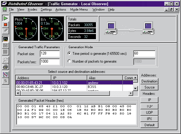 Рисунок 1. Параметр Packets/sec задает интенсивность генерируемого трафика. Параметр Packet size задает размер генерируемых кадров. Параметр Destination задает МАС-адрес, куда будет производиться генерация. Параметры IP/TCP/UDP/IPX определяют формат генерируемых данных.