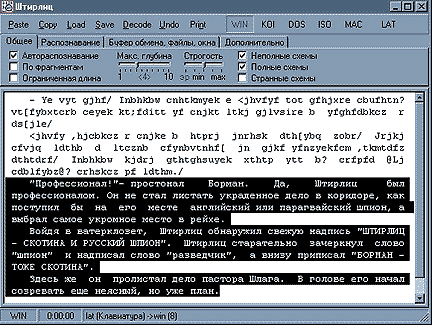 Любой код с простой заменой символов без труда поддается расшифровке. (В свое время автору, не располагающему никакими подручными средствами, пришлось самостоятельно расшифровывать нечитаемые письма с помощью метода, описанного еще Конан-Дойлем в рассказе «Пляшущие человечки».) Методические наработки в этой области не могли остаться незамеченными, и в Сети стали появляться написанные отечественными разработчиками программы для преобразования нечитаемых писем в удобоваримый вид. Наш выбор пал, в итоге, на разработку Всеволода Лукьянина (Vsevolod.Lukanin@usu.ru.) - программу Shtirlitz (http://www.lyceum.usu.ru/download/shtirl3!.exe). Разработчик постарался обобщить имевшийся на момент написания программы опыт решения проблем с кодировкой почтовых сообщений и даже, что видно из текста файла подсказки, подвести под него некоторую теоретическую базу.