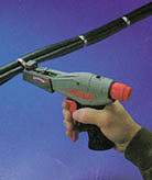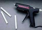 Разогрев и дозированная подача клея осуществляются с помощью клеевого пистолета. Клей в пистолет загружается с тыльной части в виде прутков определенного диаметра и разогревается в объемной камере для достижения быстрой и равномерной подачи. Клей выдавливается через имеющееся на конце ствола небольшое металлическое сопло при нажатии курка дозатора. Конструкция сопла позволяет использовать его для повторного разогрева нанесенного на поверхность клея.