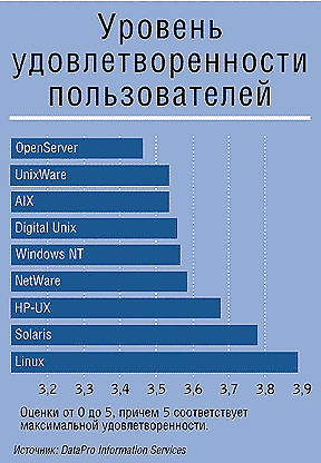 Проведенный в 1997 году компанией DataPro Information Services опрос 800 пользователей выявил, что среди девяти основных операционных систем Linux получил наивысшие оценки в категории «удовлетворенность пользователя» (см. Рисунок 1). Кроме того, опрос показал, что среди десятка крупнейших операционных систем только две - Windows NT и Linux - увеличили свою долю на рынке с 1996 по 1997 год.