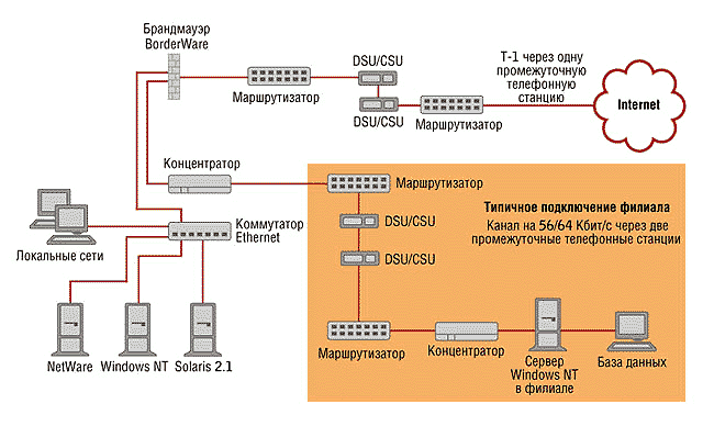 Рисунок 1. Конфигурация сети предполагает прямые соединения с Internet, а также подключения филиалов по глобальной сети. Один из подключенных напрямую к нашему центру управления сетью маршрутизаторов оказался потенциально уязвим для взлома.