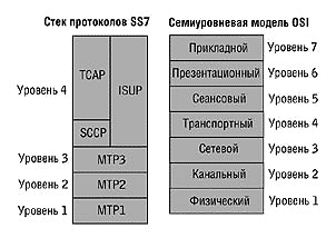 Рисунок 2. Стек протоколов SS7 состоит из четырех уровней, причем три нижних соответствуют первым трем уровням модели OSI.