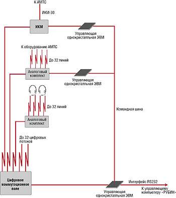 В принципе, аппаратно-программным комплексом является любая система автоматизации, включая настольные ПК, но в данном случае этот термин означает, что разработчики реализовали собственные аппаратные и программные решения. Аппаратная часть представляет собой блоки, которые заменяют высокие, до потолка, стойки щелкающих реле коммутаторов и преобразующих устройств (стативного оборудования). Небольшой шкаф с блоками адекватен по канальной емкости целой "стене" аналоговых устройств. Структурная схема аппаратной части ЦМТК "РУБИН" показана на Рисунке 1. Каждый блок имеет микропроцессор, управляющий работой от одной до восьми плат канальных окончаний (поддерживаются как аналоговые каналы и линии, в том числе гарнитуры телефонисток, так и ИКМ). Всего один блок способен обслуживать от 1 до 32 линий, объединяя их в двухмегабитный поток; максимальное же число поддерживаемых голосовых каналов составляет до 2048, включая гарнитуры. Блоки объединены единым полнодоступным цифровым коммутационным полем. Устройство работает под управлением сервера на базе ПК.