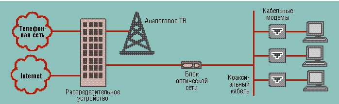 Рисунок 1. В гибридной оптической/коаксиальной сети КТВ оптический кабель прокладывается между распределительным устройством и блоком оптической сети (Optical Network Unit). Оставшуюся часть пути сигнал передается по коаксиальному кабелю.