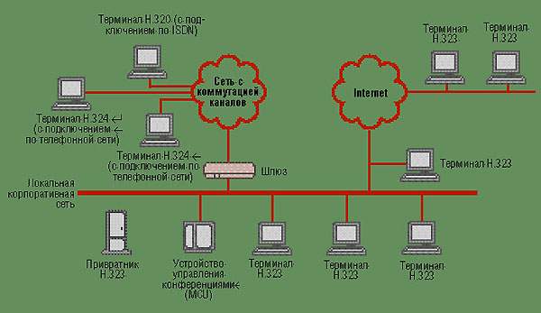 Рисунок 2. Сеть H.323 имеет четыре основных компонента: терминалы, шлюзы, привратники и MCU.