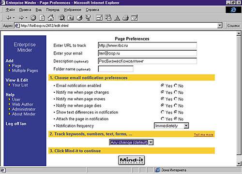 После инсталляции Enterprise Minder запускает два сервисных процесса Windows NT: Minder и Responder. Первый, собственно, и является службой оповещения, в то время как второй отвечает за общение с пользователями. Никакого дополнительного клиентского ПО для работы с программой не требуется, все настройки осуществляются через браузер Web. Пользователь обращается к серверу Enterprise Minder и указывает адрес машины, на которой запущен сервер, и номер порта, который по умолчанию равен 2412. После регистрации в системе - ввода имени (для Minder им является адрес электронной почты) и выбора пароля - пользователь получает возможность добавлять адреса ресурсов Internet (URL) и совершать с ними определенные манипуляции. Так, для каждой страницы Web пользователь может указать различные режимы оповещения об изменениях. Оповещение может осуществляться немедленно, раз в день, раз в два дня и раз в неделю, и отправляться не только в случае изменений на странице Web, но и при ее "переезде" на новый адрес или даже "закрытии". Кроме того, извещение может содержать и саму страницу Web для ее немедленного просмотра. При работе в Intranet в теле письма могут быть указаны все произошедшие в тексте Web-страницы изменения.