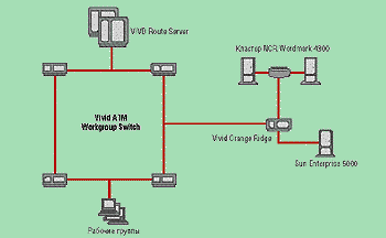В реализации Newbridge MPOA имеет еще одно преимущество за счет того, что ядро сети (см. Рисунок 1) представляет собой распределенный маршрутизатор (или, точнее говоря, коммутатор третьего уровня), и, как следствие, вся система оказывается более устойчива к сбоям ее отдельных устройств. Newbridge выделяет сервер маршрутизации MPOA (MPS) в отдельное устройство VIVD Route Server, обслуживающее (в рассматриваемом примере) четыре центральных коммутатора Vivid ATM Workgroup Switch. Если быть точными, то для повышения надежности функционирования системы в ядре сети Фонда установлены два сервера маршрутизации. Таким образом, все ядро поддерживает функции маршрутизации, но при этом оно состоит не из маршрутизаторов, а из менее дорогостоящих коммутаторов. Более того, выход из строя любого из них никак не скажется на работе сети, кроме очевидного уменьшения номинальной производительности. В качестве коммутаторов рабочих групп используются устройства Vivid Yellow Ridge, а серверы обслуживаются коммутаторами Vivid Orange Ridge. Управление сетью осуществляется при помощи ПО Vivid System Manager. Оно обеспечивает мониторинг и конфигурирование системы и, в частности, заметно упрощает работу по организации VLAN.