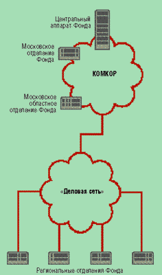 Связь между локальными сетями центрального аппарата и низовых подразделений осуществляется двумя путями. Московское городское и областные отделения подключены к центральному аппарату через волоконно-оптическую сеть КОМКОР, связь с региональными отделениями организована по электронной почте (провайдер — «Деловая сеть») (см. Рисунок 2). В дальнейшем все региональные отделения планируется (для чего изучается опыт работы пилотных проектов) подключить к сети центрального аппарата через «Деловую сеть», а локальные отделения по-прежнему будут связываться с региональными по электронной почте, так как срочность обработки и передачи первичной (если можно так выразиться) информации не столь критична.
