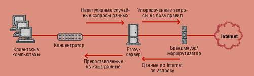 Приведенная аналогия объясняет две основные функции proxy-сервера. Во-первых, proxy-сервер действует как посредник, помогая пользователям частной сети получить информацию из Internet, когда она им необходима, при этом он обеспечивает защиту сети. Во-вторых, proxy-сервер может сохранять часто запрашиваемую информацию в кэше на локальном диске, быстро доставляя ее пользователям без повторного обращения в Internet.