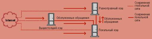 В иерархической (или многосвязной) структуре каждый кэш устанавливает отношения с другим кэшем. Отношения бывают двух типов: подчиненные и равноправные. При отсутствии запрошенного объекта кэш посылает запрос ICP о наличии требуемого объекта у какого-либо из равноправных кэшей. В случае его отсутствия и у равноправных кэшей запрос направляется вышестоящему серверу. Типичная иерархия кэшей показана на Рисунке 2.