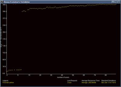 VeloMeter обладает предельно простым интерфейсом. После запуска программы пользователю предлагается ввести тестируемый URL, точнее, доменное имя сервера и список из нескольких URL (можно, конечно, обойтись и одним адресом), а также количество условных пользователей и производимых ими запросов. После ввода начальных условий программа запускает несколько (или множество) процессов, имитирующих интенсивное обращение к ресурсам сервера. Результат выводится в виде графика среднего времени отклика сервера в зависимости от количества пользователей.