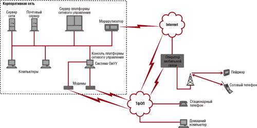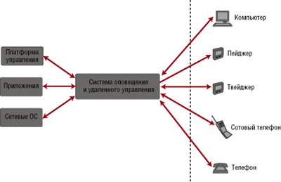 Вообще же реализация посылки сообщений на пейджер на уровне каждой прикладной программы, сама по себе, является ущербной. (Справедливости ради стоит сказать, что не многие программы предоставляют такую возможность, что лишь подчеркивает отсутствие целостности концепции.) Среда для приема и обработки событий должна быть консолидированной. Именно в таком качестве выступает платформа управления ресурсами или система сетевого управления. Сюда стекается вся информация о событиях в сетевой инфраструктуре, в приложениях, в системе электроснабжения и т. п. Система оповещения и управления осуществляет лишь взаимодействие между платформой управления и средствами связи администратора.