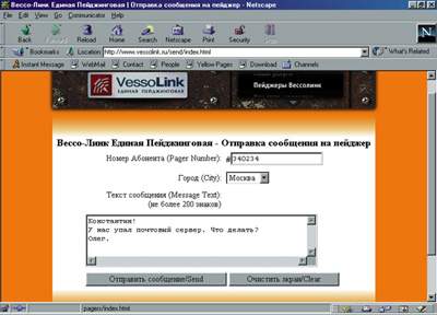 Передавать сообщения на пейджер можно также через серверы Web пейджинговых компаний (см. Рисунок 2). Но для систем оповещения такой способ не совсем пригоден, поскольку он предполагает интерактивное взаимодействие человека с сервером. Правда, при минимальном знании технологии Web администратору не составит труда написать сценарий автоматического заполнения формы передачи сообщений через сервер Web, после чего такой сценарий остается только подставить в систему оповещения. Так же как и в случае электронной почты, отдельной телефонной линии не требуется, а ограничения на используемые символы отсутствуют.