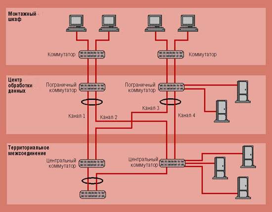 В соответствии с решением 3Com, объединение каналов будут поддерживать центральные коммутаторы территориальной сети, а также пограничные коммутаторы для центров обработки данных или серверных комнат. Каждый коммутатор центра обработки данных должен быть связан со всеми центральными коммутаторами территориальной сети; благодаря MPLA каналы 1 и 2 будут выглядеть как один канал и обеспечивать двойную пропускную способность между центром и территориальным межсоединением. Каналы 3 и 4 будут также восприниматься как один канал с удвоенной пропускной способностью (см. Рисунок 2).