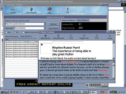 Задача собственно поиска в гипертекстовом документе (без ведения базы данных индексов, учета вариаций грамматических форм и прочих функций развитых поисковых механизмов) не ставит серьезных технических проблем с точки зрения программирования, поэтому соответствующие средства можно без труда найти среди условно-бесплатного ПО. Например, помещенная на сервере http://www.illumix.com программа SelfSeek! позволяет осуществлять поиск по ключевым словам на серверах Web. Программа распространяется в двух вариантах — бесплатном и платном. Единственная разница между ними заключается в том, что если программа бесплатная, то внизу ее окна будет периодически отображаться сменяемая баннерная реклама. Если же вы оплатите SelfSeek!, то рекламы не будет.