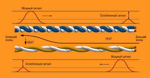 - переходное затухание на ближнем конце имеет такое важное значение потому, что на ближнем конце передаваемый сигнал имеет наибольшую мощность, а принимаемый сигнал — наименьшую. В результате принимающая пара оказывается особенно восприимчива к помехам со стороны передающей пары. Суммарное переходное затухание учитывает влияние нескольких активных пар;