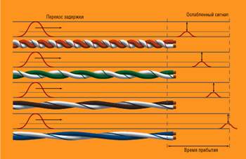 Когда все четыре пары активны, сигналы должны прибывать согласованно. Измеряемый в наносекундах перекос задержки характеризует разницу во времени поступления сигналов по разным парам кабеля. Если эта разница окажется чересчур велика, то принимающее устройство будет не в состоянии восстановить сигнал. В конечном итоге это приведет к ошибкам и потере данных.