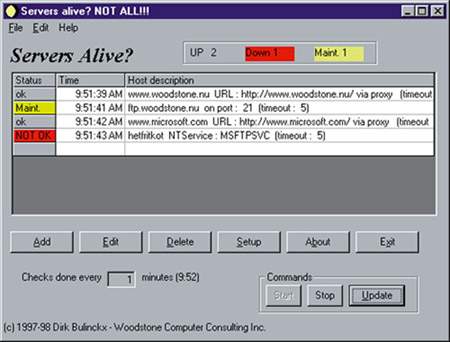 Тем не менее в Internet можно найти достаточно удобные и практически бесплатные утилиты, вполне способные решить перечисленные выше задачи. Наше внимание привлекла программа Servers Alive компании Woodstone Computer Consulting (http://www.woodstone.nu/salive/). Она обеспечивает мониторинг нескольких серверов (до 10 в бесплатной версии и до 1000 при уплате 69 долларов) и оповещение администратора о нештатных ситуациях в реальном времени.
