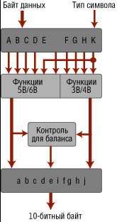 Некодированная информация разбивается на блоки по 8 бит: A, B, C, D, E, F, G, H, плюс контрольная переменная Z (см. Рисунок 1). Последняя может принимать значение D в случае обычных символов данных (D-типа) или K в случае специальных символов (K-типа). Эта информация преобразуется в соответствии с правилами 8B/10B в так называемый передаваемый символ (Transmission Character) из 10 бит: a, b, c, d, e, i, f, g, h, j. Правила, в частности, предусматривают, что передаваемый символ D-типа должен содержать не менее четырех нулей и единиц, причем число идущих подряд нулей или единиц не должно быть больше четырех. Каждый имеющий смысл передаваемый символ имеет свое обозначение Zxx.y в соответствии со следующим соглашением: Z — контрольная переменная; xx — десятичное значение двоичного числа, составленного из битов E, D, C, B и A, а y — десятичное значение двоичного числа, составленного из битов H, G, F. Так, например, передаваемый символ для специального (т. е. К-типа) байта 10111100 обозначается как K28.5. Иногда он называется также запятой (comma).