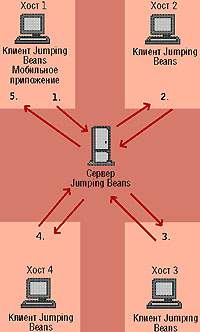| Рисунок 2. Архитектура Jumping Beans. Каждый прыжок приложения с одного хоста на другой осуществляется через сервер домена Jumping Beans, реализующий меры защиты и сохраняющий промежуточные состояния, благодаря чему любой прерванный процесс может быть восстановлен. На этой диаграмме рабочая станция 1 создает приложение и отправляет его по маршруту «рабочая станция 2 — рабочая станция 3 — рабочая станция 4», после чего приложение возвращается на станцию 1. |