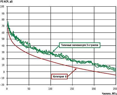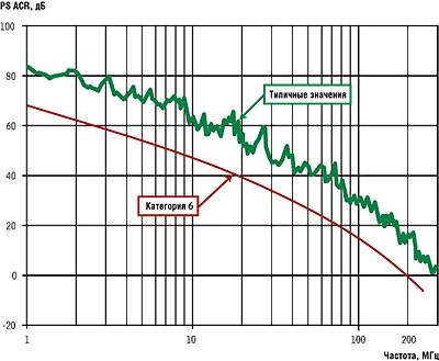 | Рисунок 3. Суммарная защищенность на ближнем конце (PS ACR) для тракта (Channel) System 6 компании Siemon. |