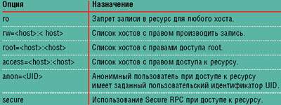 Некоторые наиболее популярные опции перечислены в Таблице 1. Фактически опции описывают права доступа к экспортируемым ресурсам со стороны клиентов. Важно помнить, что права доступа, перечисленные при экспортировании, никоим образом не отменяют права доступа, действующие непосредственно в файловой системе. Например, если файловая система экспортируется с возможностью записи, а конкретный файл имеет атрибут «только для чтения», то его изменение будет невозможно. Таким образом, при экспортировании права доступа выступают в качестве дополнительного фильтра. Более того, если, скажем, файловая система экспортируется с опцией ro (read only), то клиент имеет право смонтировать ее с опцией rw (read/write), однако при этом попытка произвести запись приведет к выдаче сообщения об ошибке.