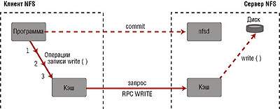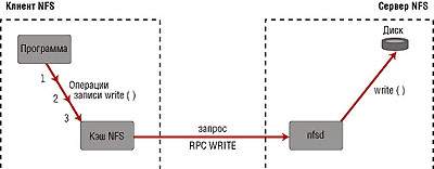 Очень важной особенностью NFS v2 является то, что на стороне сервера операции записи не кэшируются (см. Рисунок 2). Это было сделано в целях обеспечения высокой надежности сервиса NFS и позволяет гарантировать целостность данных после перезагрузки сервера в случае его отказа. Отсутствие кэширования информации при записи представляет собой самую большую проблему NFS v2. На операциях записи NFS значительно уступает конкурирующим технологиям, хотя на операциях чтения мало в чем им проигрывает. Единственный метод борьбы с невысокой производительностью записи состоит в использовании дисковых подсистем с независимым от электропитания встроенным кэшем, как в довольно дорогих массивах RAID.