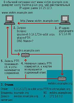 | Рисунок 1. В данном примере DNS атакующего ответственна за сеть 172.16.0 (0.16.172.in-addr.arpa). Атакующий присваивает обратный адрес 172.16.0.8 хосту с именем trustme.plain.org. Злоумышленник подключается к victim.example.com для исследования его доверительных взаимоотношений с trustme.plain.org. Атака оказывается успешной, потому что протокол DNS не предусматривает какого-либо механизма предотвращения назначения владельцем обратного адресного пространства доменных имен за пределами его области полномочий. |