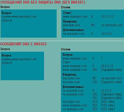 | Рисунок 2. Два примера ответов и запросов DNS с DNSSEC и без оных. Обратите внимание, что в ответе с DNSSEC ответное сообщение содержит не только подписи и ключи, необходимые для проверки информации, но и сам исходный вопрос. Эта процедура называется "Аутентификацией транзакции и запроса". Благодаря ей запрашивающая сторона может быть уверена, что она получила ответ на тот вопрос, который задавала. |
