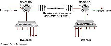 Содержащий несколько длин волн световой сигнал поступает в левый циркулятор через порт 1 и направляется через порт 2 в последовательную цепочку настраиваемых волоконных дифракционных решеток. В пассивном состоянии решетки пропускают все длины волн, в активном же каждая из них отражает ту длину волны, на которую она была настроена. Отраженные длины волн поступают через порт 2 обратно в циркулятор и выходят из него через порт 3 на демультиплексор, где они разделяются и распределяются каждая на свой порт. Неотраженные волны входят в правый циркулятор через порт 1 и выходят из него через порт 2.