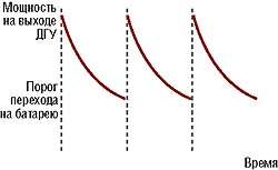 Этот же подход означает, что ДГУ вступает в действие практически сразу после исчезновения напряжения на входе. Таким образом, в случае, когда электропитание пропадает и восстанавливается с интервалом в несколько минут, дизель-генератор будет регулярно отключаться/запускаться. С точки зрения эксплуатации системы частые переходы в рабочий режим и обратно в состоянии ожидания крайне нежелательны как для ДГУ, так и для ИБП. Для двигательной установки запуск — самый экстремальный с точки зрения износа режим, а для батарей таким режимом является увеличение количества циклов разрядки/зарядки.