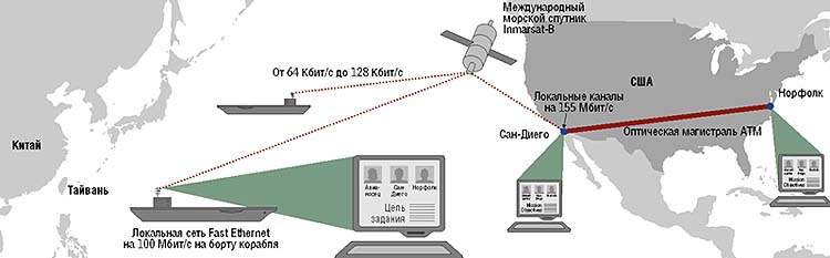 | Небо, я — земля! Амбициозный проект флота по модернизации сети под кодовым названием «IT-21» позволяет связать находящиеся в Штатах командные пункты с боевыми кораблями в горячих точках по всему земному шару с помощью коммерческих и военных спутниковых систем и организовать с их помощью сеансы видеоконференц-связи между командованием и моряками. |