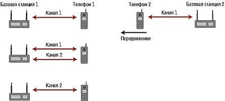 Благодаря непрерывному анализу локального эфира и динамическому распределению частот, абонент может быть передан (handover) от одной станции к другой или переведен с одного канала (в случае возникновения помех) на другой без прерывания разговора (см. Рисунок 2). В этом случае абонентское оборудование устанавливает связь по другому каналу (с той же или другой станцией в зависимости от ситуации), после чего ранее занятый канал освобождается. В случае перехода из соты в соту критерием смены станции является снижение мощности сигнала прежней станции по сравнению с новой.