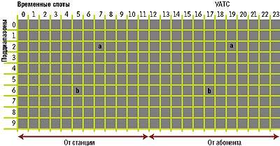 Собственно радиоинтерфейс в DECT базируется на методе, название которого представляет собой комбинацию трех аббревиатур MC/TDMA/TDD и последовательно расшифровывается, как «множественные несущие», «множественный доступ с временным мультиплексированием», «дуплексная связь с разделением по времени» (см. Рисунок 1). Эта длинная формулировка объясняется в действительности достаточно просто. DECT задействует 10 несущих частот в уже упомянутом диапазоне. Шкала времени делится на окна, каждое длительностью 10 мс. В свою очередь каждое окно делится на 24 индивидуальных слота или кванта времени. Для организации базового речевого сервиса в DECT требуется два слота с интервалом в 5 мс между ними; эти слоты объединяются в пары для организации полнодуплексного канала на 32 Кбит/с (с кодировкой ADPCM G.726). Для удобства каждая группа из 24 слотов разбивается на две половины (по дюжине слотов в каждой). Первая половина используется устройством доступа, вторая — абонентским устройством.