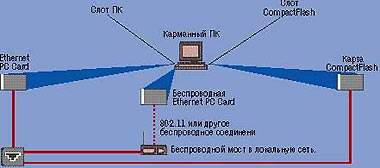 Подсоединение карманного ПК к сети с помощью одной из этих карт не представляет трудностей. Рисунок иллюстрирует, как карманные устройства могут быть подсоединены напрямую к локальной сети с помощью либо стандартных сетевых PC Card, либо карт CompactFlash.