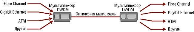 Рисунок 2. Устройства DWDM позволяют одновременно использовать одни и те же волокна для разных приложений.