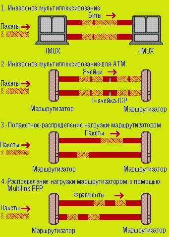Другим популярным методом объединения каналов является подключение маршрутизаторов к параллельным каналам глобальной сети. Для «разделения нагрузки» маршрутизаторы выполняют алгоритмы трансляции (коммутации) пакетов — программный аналог истинного распределения нагрузки, обеспечиваемого мультиплексирующими системами. Маршрутизаторы с разделением нагрузки направляют пакеты третьего уровня в несколько каналов в соответствии с параметрами маршрутизации и правилами трансляции пакетов. Разделение нагрузки может реализовываться в виде встроенной функции программного обеспечения или в соответствии со стандартом IETF на Multilink PPP (проект стандарта содержится в RFC 1990).