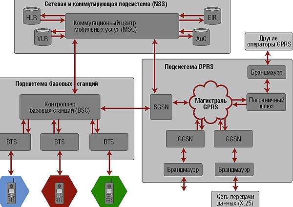 Риcунок 1. Архитектура сети GSM с поддержкой сервиса GPRS.