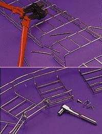 Поэтому в последнее время все большую популярность приобретают лотки из стального оцинкованного прутка. Их конструкция позволяет легко изготавливать абсолютно любые изгибы, смещения, соединения посредством удаления сегментов погонажных элементов, их гибки и закрепления скобами. Такие лотки удобны для изготовления горизонтальных и вертикальных прогонов. Они могут крепиться к стенам на Г- или С-образных кронштейнах, а также к потолку на подвесках (с двух сторон или по центру). Их монтаж прост и экономичен, а номенклатура используемой фурнитуры и крепежа — минимальна. Для резки прутка требуются специальные кусачки для металла, а для сборки — всего лишь торцевой гаечный ключ.