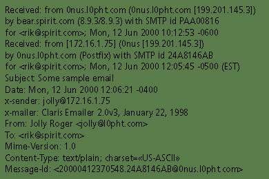 С точки зрения получения реальной информации об отправителе почтового сообщения заголовки Received: представляют существенно больший интерес, чем заголовки From:, которые легко фальсифицируются. Вообще говоря, любая строка заголовка может быть в какой-то мере подделана, так как заголовки представляют собой лишь текстовые данные, и только те из них, которые формируются вызывающими доверие серверами, могут считаться достоверными. Заголовки Received: добавляются каждым почтовым сервером, ретранслирующим данное сообщение, причем самый последний в цепочке почтовый сервер находится на первой позиции, а первый сервер, ретранслировавший сообщение, — на последней. На Рисунке 1 первый заголовок Received: показывает, что сервер bear.spirit.com получил сообщение для адресата rik@spirit.com от узла 0nus.l0pht.com.