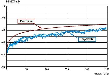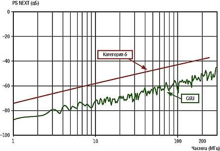 | Рисунок 1. Суммарное переходное затухание на ближнем конце (PS NEXT) для кабеля C6U компании Brand-Rex. |